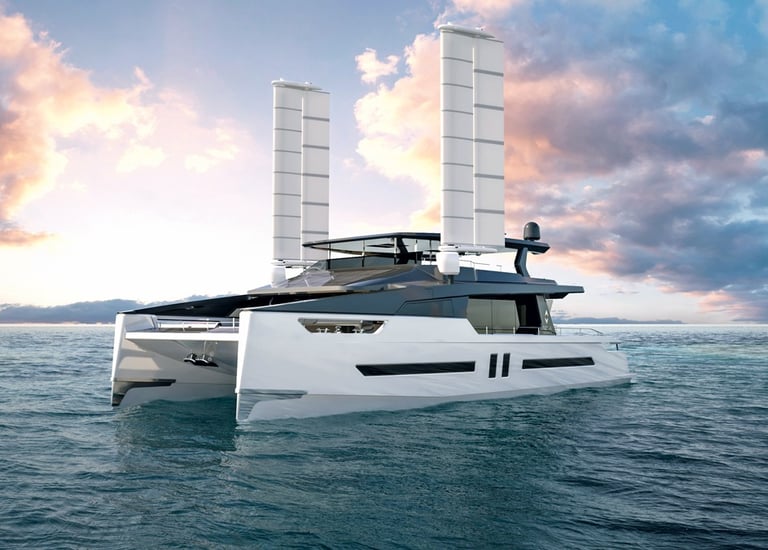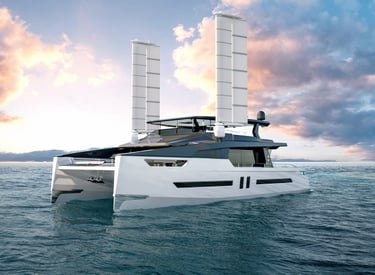 Hydrogen-powered superyacht designed as a next-generation catamaran Complete interior design fully developed by our studio Layout conceived for charter use, encouraging fluid circulation and social interaction Use of raw, noble materials for an authentic, refined, and sustainable aesthetic
